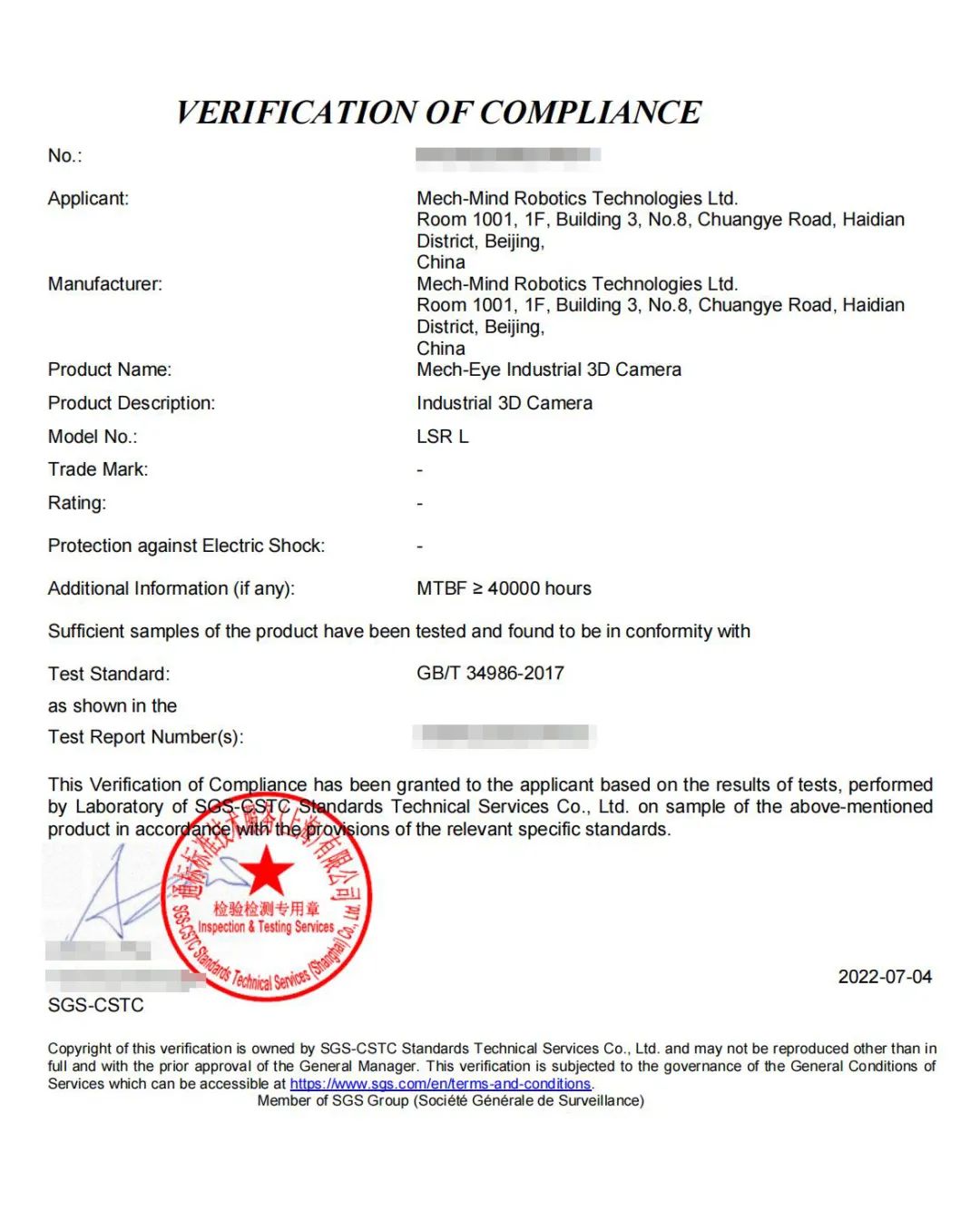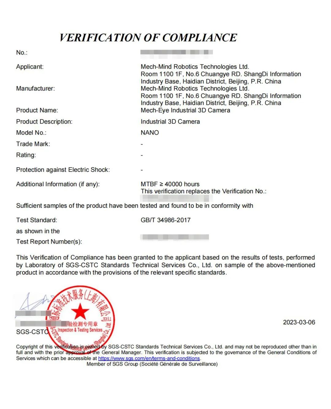 梅卡曼德本次测试严格按照GB/T 34986-2017/IEC 62506:2013标准进行,完全符合国内及国际标准。测试过程中,梅卡曼德工业级3D相机Mech-Eye在提高实验环境温度的条件下,连续不间断运行。专业人员通过精确分析3D相机关键技术指标后得出结论:梅卡曼德3D相机在测试过程中零失效,成功获得MTBF≥40000小时认证,相当于连续1666余天无故障稳定运行。