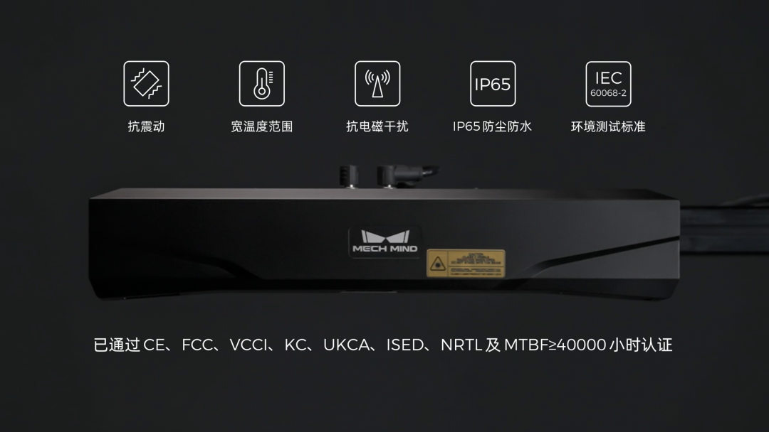 梅卡曼德Mech-Eye工业级3D相机除MTBF≥40000小时认证外,还通过了CE、FCC、VCCI、KC、UKCA、ISED、NRTL等多项国际认证,符合IP65防护等级及IEC 60068-2环境测试标准,更好应对粉尘、潮湿、震动、高温、电磁干扰等复杂情况。