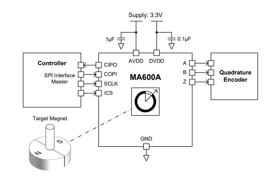 MA600A的优势在于其精度与适配性。精度方面,其工作范围内的精度小于0.6度,经校准后的最终误差(INL)可小于0.1度;适配性方面,MA600A的工作电压为3V至3.6V,支持SPI、ABZ、PWM、UVW以及SSI的通信接口能够适用于多种通信协议场合,加上支持菊花链配置,该传感器的配置更加灵活,同时MA600A采用QFN-16封装,直径只有3mm,能够轻松装配到灵巧手中的各个位置。