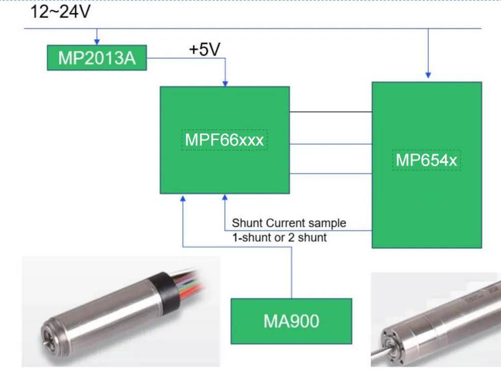 首先,MPS针对人形机器人小型化、模块化关节设计的需求,推出了基于系统级封装(SiP)与合封技术(Co-Packaging) 的微型伺服驱动模组。该方案将专用控制MCU、电机驱动IC(如MP(Q)6547/AMP6543)以及功率MOSFET进行同封装集成,形成了“控制+驱动+功率”一体化模块。