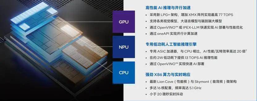 这颗 SoC,就是酷睿 Ultra 处理器。它在单一封装内集成了 CPU、英特尔锐炫™ GPU 和 NPU,并让三者协同工作,AI 推理能力、高性能 CPU 计算与工业级实时控制,「一手」拿捏。