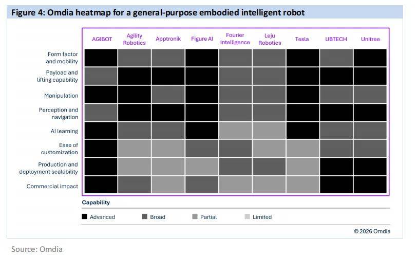 Omdia从产品形态与移动性能、负载能力、操作能力、感知与导航、AI学习能力、定制便捷、规模量产能力以及商业应用潜力八大维度对人形机器人厂商进行了综合评判,并用热力图模型的样式进行直观呈现,各厂商的长板与短板一目了然。