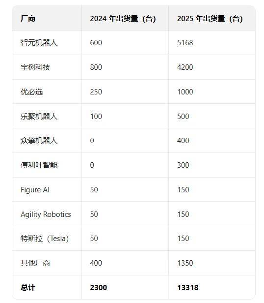 报告数据显示,2025年全球人形机器人总出货量飙升至13318台。这个数字,是去年出货量的近6倍。