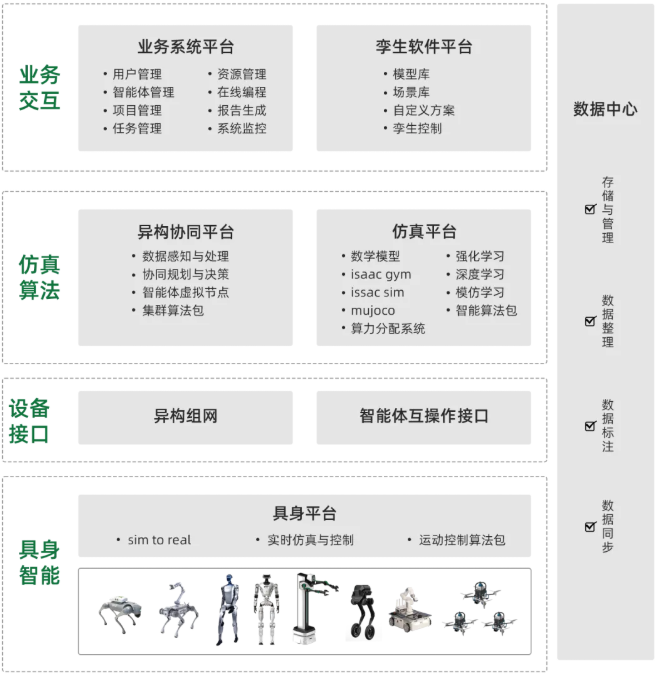 智脑系统采取“大小脑”深度融合架构,大脑采取端到端分层构架,内置多种强化学习算法于一体,小脑内置运动控制与感知系统,实现了在智能体开发、管理、跨平台协作与场景适应性等方面的关键技术节点。系统支持云端/本地部署与“一脑多形”机器人应用解决方案,具有很强的开放性,目前已接入多家生态伙伴的四足机器狗、人形机器人、复合机器人等多类别智能体,并在智能安防、巡检作业、科学研究等领域初步实现了场景化应用。