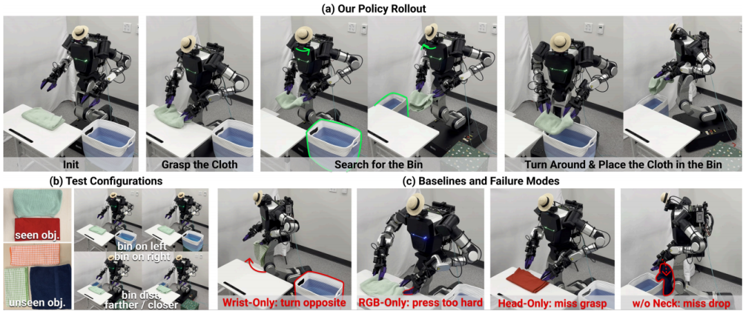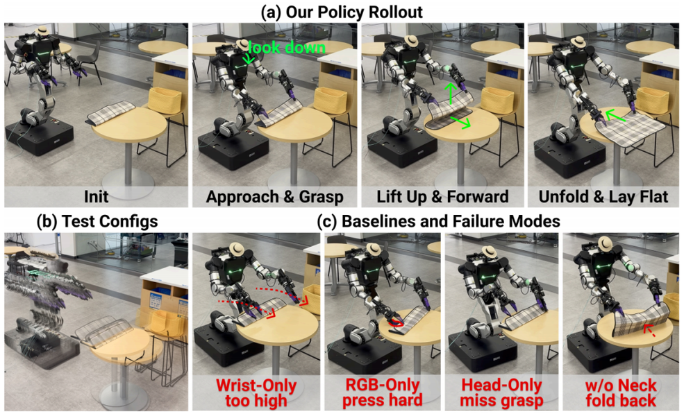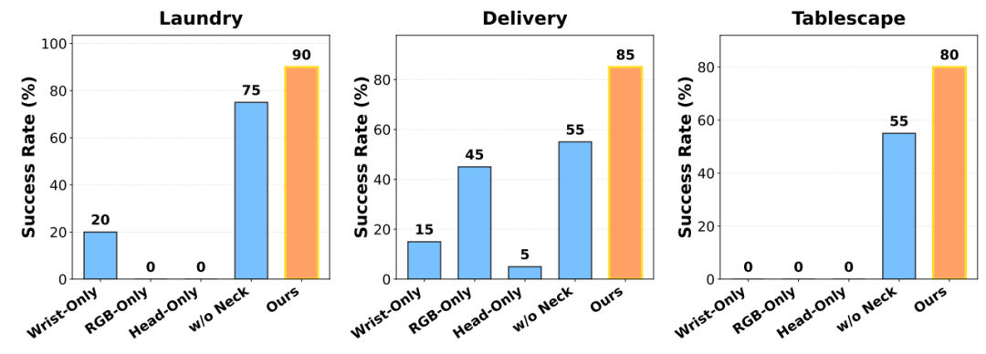 实测表明:腕部局部接触信息与头部全局场景认知是完成复杂操控的必要条件;与身体形态无关的3D视觉及头部动作 表征 是解决人机差异的核心,简单添加头部RGB会因形态不匹配导致失败;主动头部控制可维持观测有效性,关闭后会显著降低成功率。