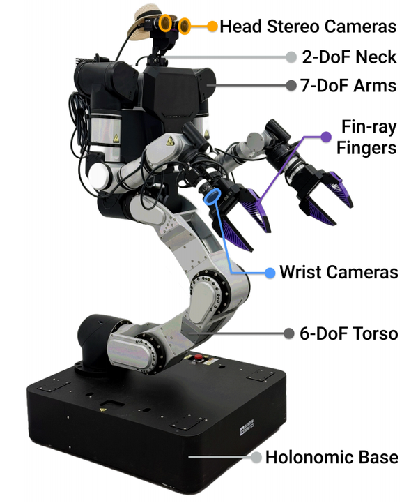 硬件层面,团队基于Rainbow Robotics RB-Y1搭建双手机械臂移动操控平台,搭载7自由度双臂、6自由度躯干、2自由度颈部,基座采用全向移动结构;颈部装配工业级广角立体相机,腕部配备与采集设备同规格相机,夹爪替换为与UMI采集设备一致的鳍状手指,硬件端完全对齐数据采集与机器人部署的感知、执行组件,压缩跨身体形态迁移误差。