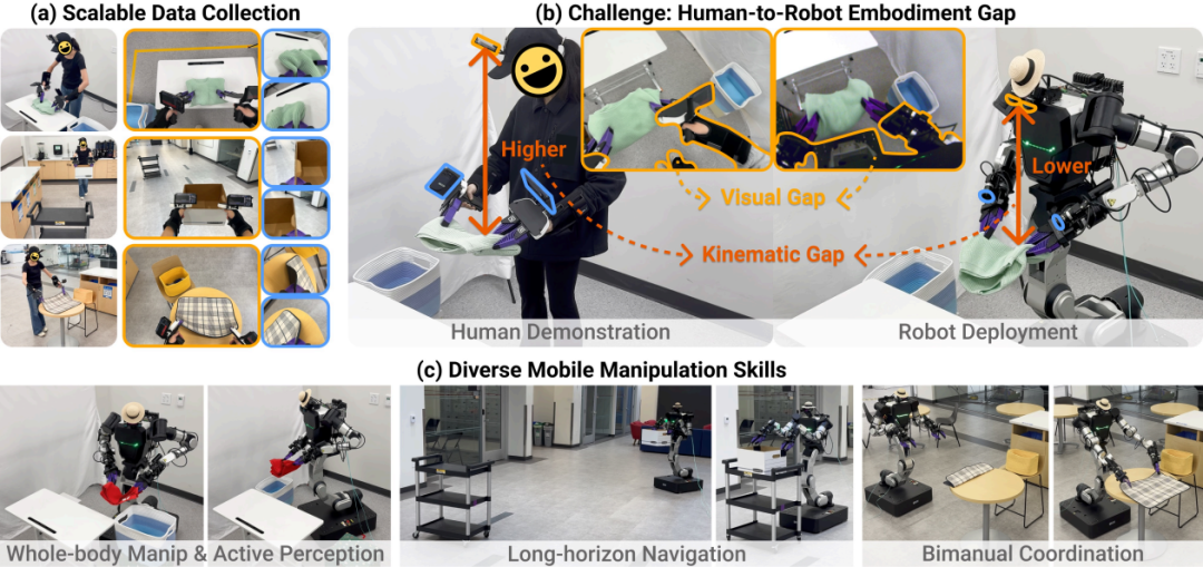 人类演示是机器人掌握现实操作技能的核心途径,却一直被人机身体差异的问题 所困扰。 外观、肢体运动结构的天生不同,让机器人很难直接模仿人类的动作,尤其是需要全身协调的移动操控任务, 缺乏 全局的环境感知, 也 难以实现 跨身体的动作迁移,规模化学习更是无从谈起。