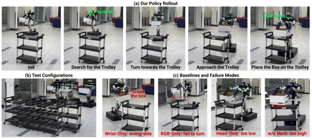 递送任务在6×6米空间进行,要求机器人双手托举盒子、寻找手推车、长距离导航并平稳放置盒子,核心考验长距离导航、双手协调和主动感知能力。HoMMI成功率85%,可实时修正导航偏差,失败原因仅为长距离导航后微小对位偏差;对照方案中,腕部仅感知成功率15%(频繁找错方向),简单添加头部RGB成功率45%(无法转向找手推车),头部仅感知成功率5%(盒子频繁碰撞),关闭主动颈部控制成功率55%(盒子放置滑落)。