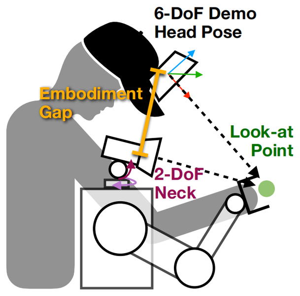 运动学层面,团队放弃照搬人类6自由度头部姿态的传统方式,提出3D注视点头部动作 表征 方法,将机器人头部运动控制转化为对3D空间注视点的控制,保留人类主动感知核心意图 的同时,也能 适配机器人运动学约束。训练时,注视点由相机中心光线与场景点云图交点计算;实际运行时,头部控制器根据注视点生成物理可行的头部朝向,适配仅2自由度颈部的标准移动机器人。