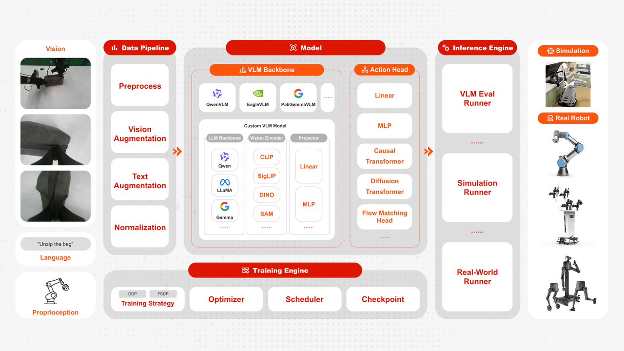 其并非又一个VLA大模型,也不是一个简单的模型集成平台。它想做的事情更基础,也更难短期见效: 为整个VLA应用链路提供一套标准化工程底座。