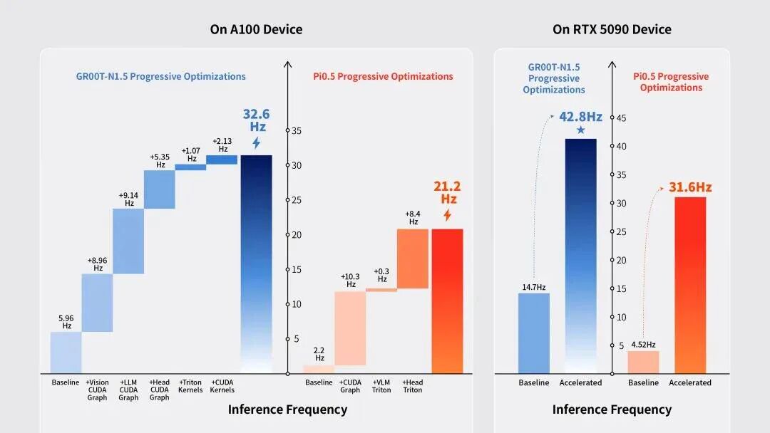 此外,为了确保真机部署后的稳定运行,FluxVLA通过底层推理引擎优化和算子融合,以及集成实时控制(RTC)等最新的轨迹平滑方法,从系统方面进行了优化。
