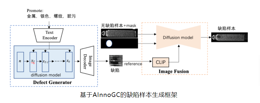 基于双阶段引导的缺陷生层模型,分别使用基于专家知识的文本引导生成局部缺陷,而后再以第一阶段生成的局部缺陷图作为引导,将缺陷融合到样本的指定区域。两阶段缺陷样本生成模型逐步聚焦局部缺陷样例和全局图像融合,可以有效地兼顾工业视觉领域缺陷样本生成的物理真实和视觉真实的要求。