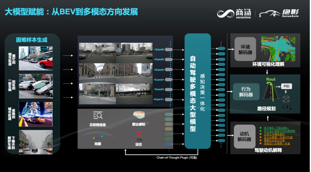 通过AIGC可生成困难样本,在模型中输入多模态数据,同时自动驾驶多模态大模型可以做到感知和决策一体化。在输出端,通过环境解码器可对3D环境进行重建,实现环境的可视化理解;行为解码可生成完整的路径规划;同时,动机解码器可以用自然语言描述推理的过程,进而使自动驾驶系统变得可以解释。