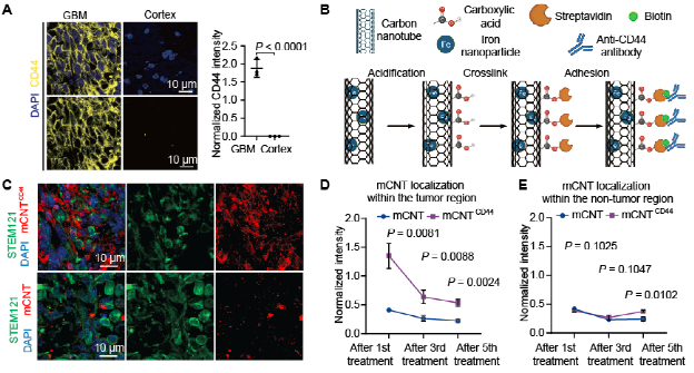 通过进一步分析胶质瘤病人数据库,研究团队发现胶质母细胞瘤细胞表面有富集表达CD44蛋白的特征。在小鼠肿瘤模型中,胶质母细胞瘤表达更多的CD44蛋白,组织化学染色分析也证实了这一点。研究团队将针对CD44的抗体合成到含铁碳纳米管表面,含铁碳纳米管在肿瘤中的富集和保留得到了大幅提升。研究团队利用带有CD44抗体的含铁碳纳米管治疗,进一步显著延长了带有胶质母细胞瘤的小鼠生存期(n>10)。