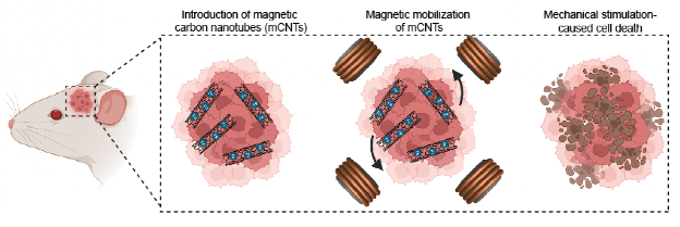 多伦多大学孙钰院士、多伦多病童医院黄熹教授研究团队合作,通过磁场控制含铁碳纳米管(magnetic carbon nanotube,mCNT),产生碳纳米管的机械运动,从而对肿瘤细胞施加机械刺激,导致肿瘤细胞死亡。研究团队发现,将含铁碳纳米管和肿瘤细胞在培养基中共同培养24小时后,施加旋转磁场可以导致肿瘤细胞死亡。因为含铁碳纳米管的机械刺激导致线粒体膜极性改变,从而导致细胞色素C释放到细胞质中,引发细胞凋亡。