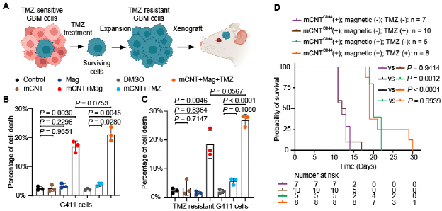 研究人员验证了含铁碳纳米管在先天性抗化疗(upfront resistance)和获得性抗化疗(acquired resistance)的胶质瘤中的治疗效果。通过CRISPR基因编辑技术敲除MSH6基因,研究团队建立了对替莫唑胺有先天性抗性的细胞。另外,通过长期替莫唑胺处理并逐渐提升替莫唑胺浓度,研究团队也筛选出了对替莫唑胺有获得性抗性的细胞。在这两种抗替莫唑胺的胶质瘤模型中,含铁碳纳米管和磁场的治疗均显著提升了带有胶质母细胞瘤小鼠的生存期。