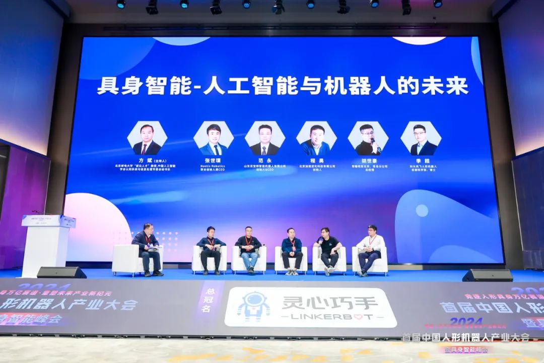 圆桌交流环节,在北京邮电大学“拔尖人才”教授、中国人工智能学会认知系统与信息处理专委会秘书长方斌的主持下,Noetix Robotics 联合创始人兼CEO张世璞;山东优宝特智能机器人有限公司创始人&CEO范永;北京加速进化科技有限公司创始人程昊;青瞳视觉北京、青岛分公司总经理胡世豪;科大讯飞人形机器人首席科学家、博士季超五位嘉宾聚焦“具身智能-人工智能与机器人的未来”这一主题,展开了深入而富有前瞻性的交流与探讨。