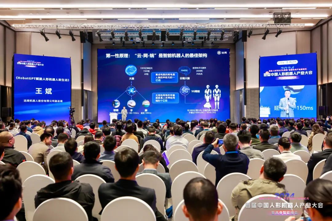 大模型驱动下,云计算平台成为必须。达闼机器人副总裁王斌发表了题为《RobotGPT赋能人形机器人新生态》的主题演讲。他强调了云端计算平台在机器人智能中的关键作用,特别是通过大模型作为决策引擎,为具身机器人开启全新可能性。达闼自研的海睿AGI平台和RobotGPT多模态大模型正赋能机器人自主进化,将带领人形机器人行业迈向一个全新的高度。